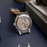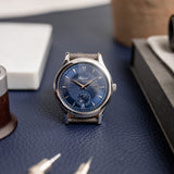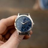 Produced between 1997-1999 but purchased in 2001, this example features an 18-carat white gold case fitted with a blue guilloché dial. The soft and elegantly restrained exterior of the 36.5mm case is gently defined by its stepped bezel before flowing into the blended lugs and case body with remarkable slenderness.