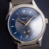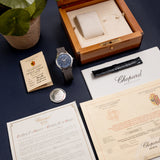 This exclusive Chopard LUC 16/1860/2 with blue guilloché dial is sold complete with its original box, warranty papers, COSC papers, Geneva Seal papers, additional hunter-style caseback, white gold pin buckle, unworn official Chopard strap, manual, and leaflets. The watch is offered in mint condition after having recently undergone a full service and is presented in like new condition.