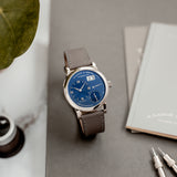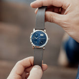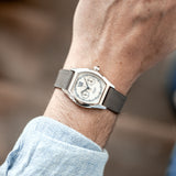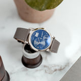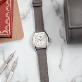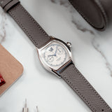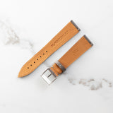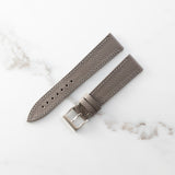 Mr Watchley Grained Mid Grey Calf strap comes from the male calfskin and is famous for its resilience and luxurious textured look thanks to the embossment of the grain patterns into the leather. This typical laminated appearance and resilient structure explains why brands like Hermès are fond of this material.