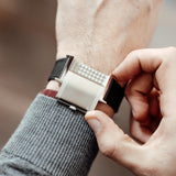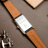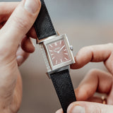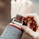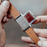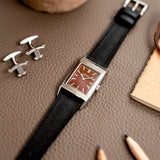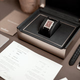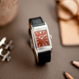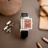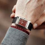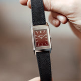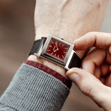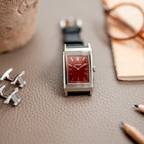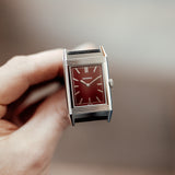 Characterized by its slender 7.3mm thick case and traditional polished gadroons framing the rectangular dial, the watch stands out with its glossy Rouge lacquer face – being vibrantly present yet discretely elegant, full of fire but whispering in tone. The seemingly simplicity of the dial, following its vintage design ethos of ‘less is more’, is further enhanced by applied rhodium-plated struck hour-markers and traditional baton hands.