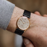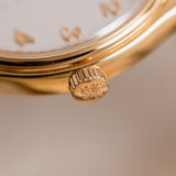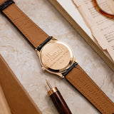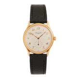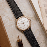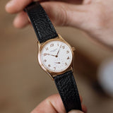 Being released in the final year of the 3923's lifespan, the appeal of this swansong edition is apparent, with its sophisticated 31.5mm case rendered in 18k pink gold. A stepped bezel and curved lugs represent the extent of this amorphous case's defining features; with the Calatrava, it's all about what the watch doesn't have than what it does. The caseback of this 3923R is closed and includes an engraving of the Harrods logo along with ‘1849 - 1999 Celebrating 150 years XX/35'. While the case form of what constitutes a Calatrava is necessary, how the dial is executed, and its lack of complication is where the true charming spirit resides.