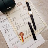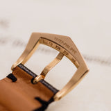 The Patek Philippe 3923R Harrods Edition dates from 1999 and is presented in mint condition. The watch is offered with an extract, service papers from Patek Philippe dated from 2018, the original Harrods pouch, original pin buckle and original gloss alligator strap. The watch is fitted to a custom-made Mr Watchley strap.
