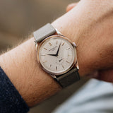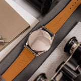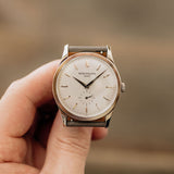 The dial is also no slouch; straightforward, refined, timeless. A silver-opaline base adorned with the lightest of vertical brushing makes way for a configuration that, since 1932, has been the template for dress watches the industry over. Unbroken dart-style applied hour markers provide a three-dimensionality, with a gracefully double pairing at twelve and a squared-off marker at six to not disrupt the subsidiary seconds register. Surrounding these immensely characterful markers is an element so synonymous with Patek, a tiny polished dot track for the minutes. While other references before and after favour more widespread markings, the dot realisation is utterly whimsical and understated. And it's the same story when it comes to time telling, with immense dauphine hands tracking the hours and minutes while a feuille hand sits within the borderless seconds register. Sharp furniture meticulously finished and formed, along with a simple 'Patek Philippe Geneve' signature is all this 5196 dial needs to make a quiet statement. A statement which in 1932, now, and eternally remains impactful and significant.