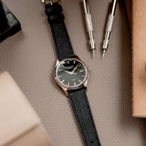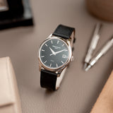 While the modestly sized 39mm case sits great on the wrist and looks fantastic, the classic double signed black "Tiffany & Co" dial has a nice matte to it. The so-called "Officer's Style" case has a gold dustcover to protect the sapphire caseback. When you open the case you can see the caliber 324 SC movement.