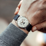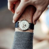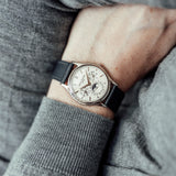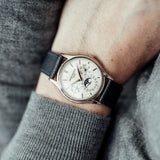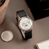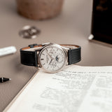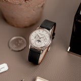 The English white dial has three sub-registers, with the months and the quartiles of the leap-year placed at 3 o’clock. In a similar fashion, the weekday and day/night-indicators are placed at 9 o’clock. The marvellous moonphase is placed at 6 o’clock, with radial dates. The dial furthermore features a minute track, beautifully interrupted by applied polished indices in white gold, giving the watch face a sudden sense of masculinity, matching the polished white gold dauphine hands.