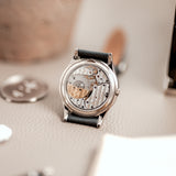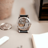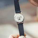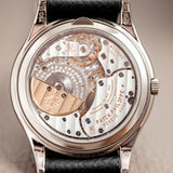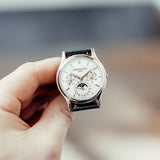 Today the Patek Philippe 5140 is no longer produced in white gold – but by exception in platinum, after the introduction of the 5327 ten years later – adding to its captivation. The 18-carat white gold case has a contemporary 37.2mm size with a refined polished profile of 9mm and a rounded bezel, measuring up to Patek Philippe’s traditional dimensions and proportions, sliding easily under the dress shirt cuff. Lug to lug the watch measures 46mm.