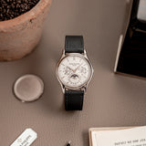 The Patek Philippe Perpetual Calendar 5140G is powered by the mechanical automatic micro-rotor 240Q movement, crafted in-house by Patek Philippe. The ultra-thin, self-winding caliber has a 38–45-hour power reserve and is being used as the heart of Patek Philippe’s perpetual calendars for over forty years. The perpetual calendar does not need any correction until the year 2100.