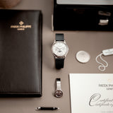 The deployant clasp buckle of the watch strap is artistry finished with the Patek Philippe Calatrava Cross, the brand’s emblem. Moreover the watch carries a sapphire case-back, offering a splendid sight on the slim, 22-carat gold micro-rotor movement, jewels and stunning hand-finishing: the Genevian coat of arms and stripes.