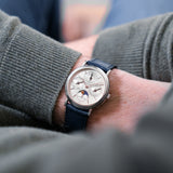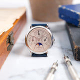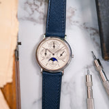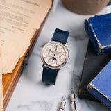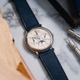 This discontinued Vacheron Constantin Perpetual Calendar, Ref. 43031 is in very good condition, and has perfect mechanical functionality. It comes as a full set, with original papers, manual, booklet, platinum pin buckle, original leather strap, and inner- and outer boxes. The Vacheron Constantin Perpetual Calendar is paired with a Mr WATCHLEY Saffiano Midnight Blue strap.